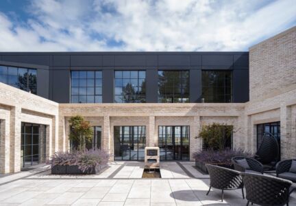 Client and architect visited Taylor Maxwell early in the design process and quickly settled on the Wienerberger Marziale brick, built solid externally and in slips on FabSpeed Proclad framing internally in the public spaces, along with Vobster’s Bathstone cast stone to provide monolithic cills and lintels at openings. The openings are expressed as heavily modelled bays to lend depth and solidity to the industrial/warehouse aesthetic, enhanced by the gridded steel windows.