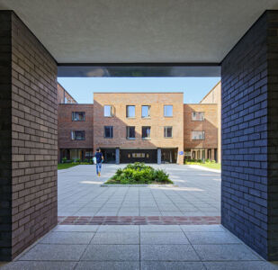 Courtyard planning creates an attractive living environment which encourages community interaction, while optimising the use of the land. The courts themselves are semi-private, accessible by residents and their visitors. Stair and lift cores are typically located at the corners of the courtyards, providing access to three or four individual flats on each floor. Each staircase has a glazed entrance area with seating with reds and engineering bricks having been made by Ibstock. Each contains different types of accommodation to provide a choice of living environment. In total there are 953 student rooms.