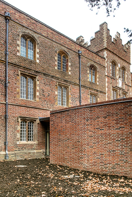 Where some colleges have struggled to find space (some even moving their entrances) Jesus College had one distinct advantage. The pedestrian entrance to the College from the street includes a sixty-metre-long path between two high brick walls, both dating from the sixteenth century. Confusingly, the path is known as ‘The Chimney’. One of these walls conceals an acre of Fellows’ Garden and also proved just high enough to conceal a new Porters’ Lodge; it is backed against the old wall. With some difficulty, Planning and Listed Building Consent were obtained to make a new stone and brick entrance through that old wall.
