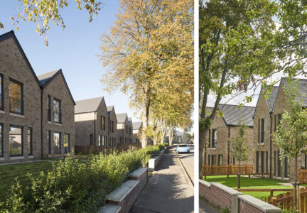 Collective Architecture was commissioned by Home Group Scotland to design 32 new houses and a children’s home on a compact brownfield site on Glasgow’s south side. The site is located on Muirskeith Road, adjacent to Newlands Conservation area: a leafy neighbourhood with beautiful sandstone villas, generous gardens and greenery. It is extremely well served in terms of local amenities and there are several schools nearby. Home Group is a housing association, social enterprise and charity, and provider of integrated housing, health and social care projects, many of which are newly built.