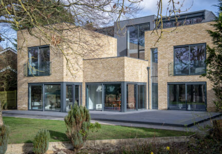 In its formal composition, the front elevation parallels the front boundary and addresses the estate positively; the stepped rear elevation creates suntraps and an expanded run of full-height glazed sliding doors linking interiors with exteriors, allowing rooms of different function to merge spatially and visually.