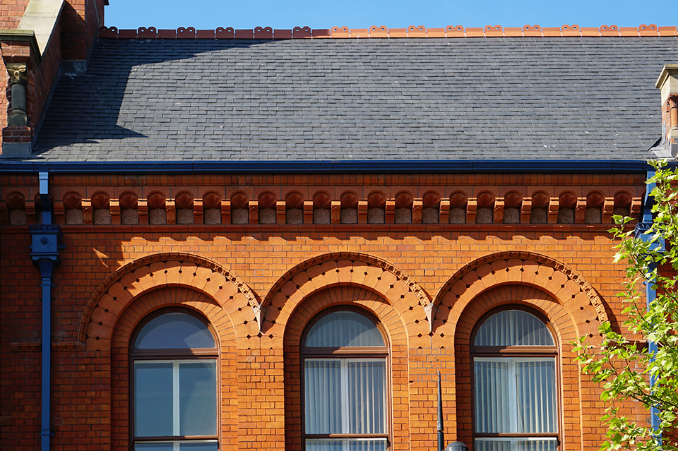 Northcot Brick created two bespoke imperial-sized blends, machine-made Regency Orange and handmade Brickfield Orange, to match the colour, texture, and precision of the original masonry. Ornate brick detailing, including decorative string courses, banding, arches, bullnose ledges, dentil courses, and embossed fleur-de-lis bricks, were repaired or remade. Where original bricks survived, they were sent to Northcot for templating and recreation, ensuring continuity of craftsmanship.
